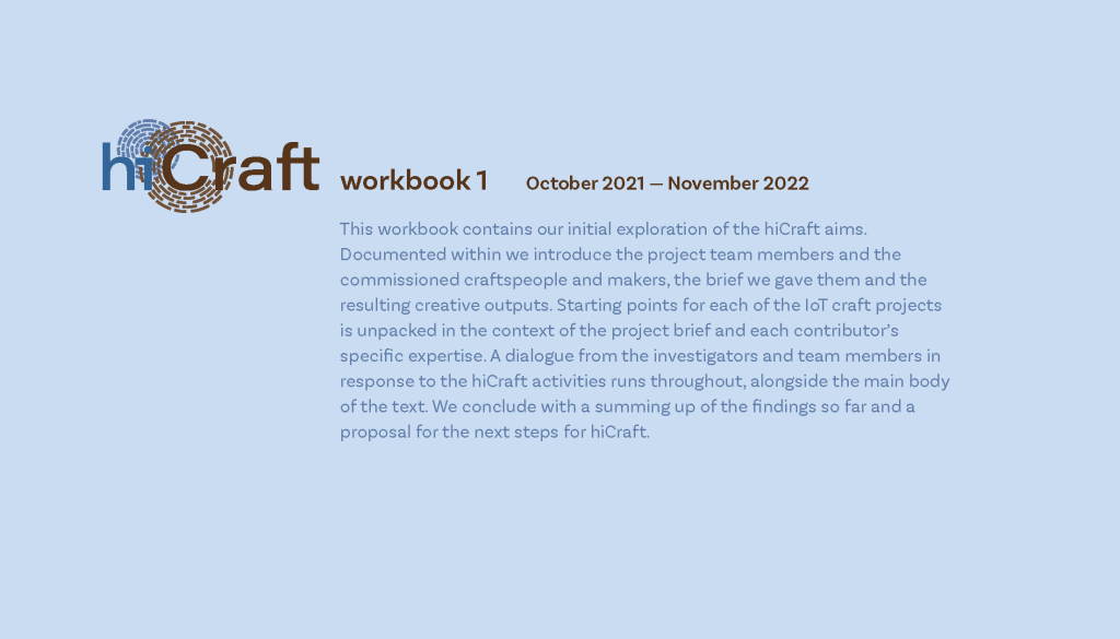 hiCraft is a 38 month AHRC funded project (completing in Feburary 2025), based in the North East of the UK, exploring healthier ways to live with IoT using craft as a methodological and practical lens. hiCraft speaks to current concerns about trust, bias and the lack of transparency around data use, focusing on IoT. Our investigation seeks to define and foster a healthy relationship between people, the internet and smart technologies using craft approaches.