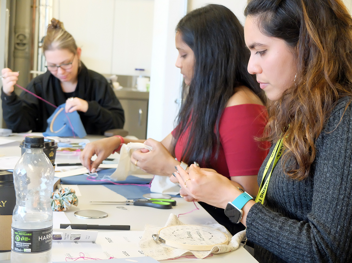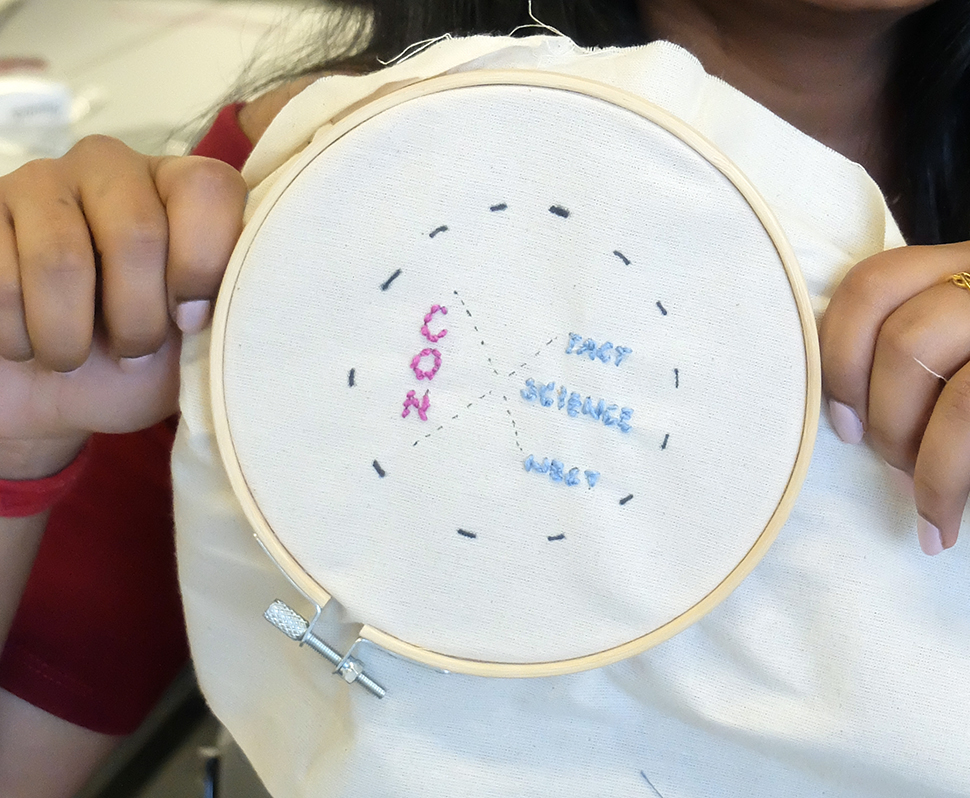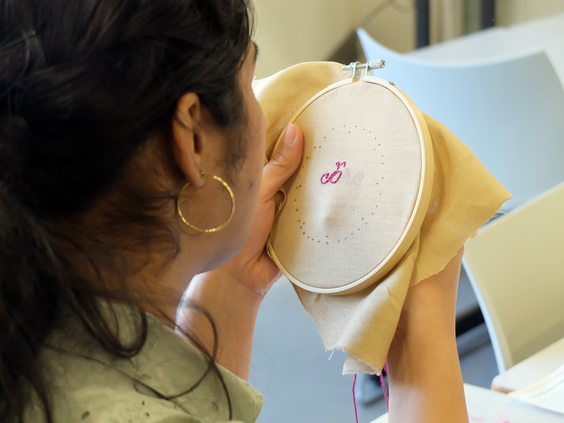 We re-ran a shortened version of our day-long workshop at the TEI conference which involved participants from the HCI community, but this time we worked with a range of creative practitioners and researchers from architecture, textiles and design. We used the conviviality of stitching together to discuss concerns, and/or aspirations, for how we might have a healthier relationship with the internet, while everyone creating their own badge.