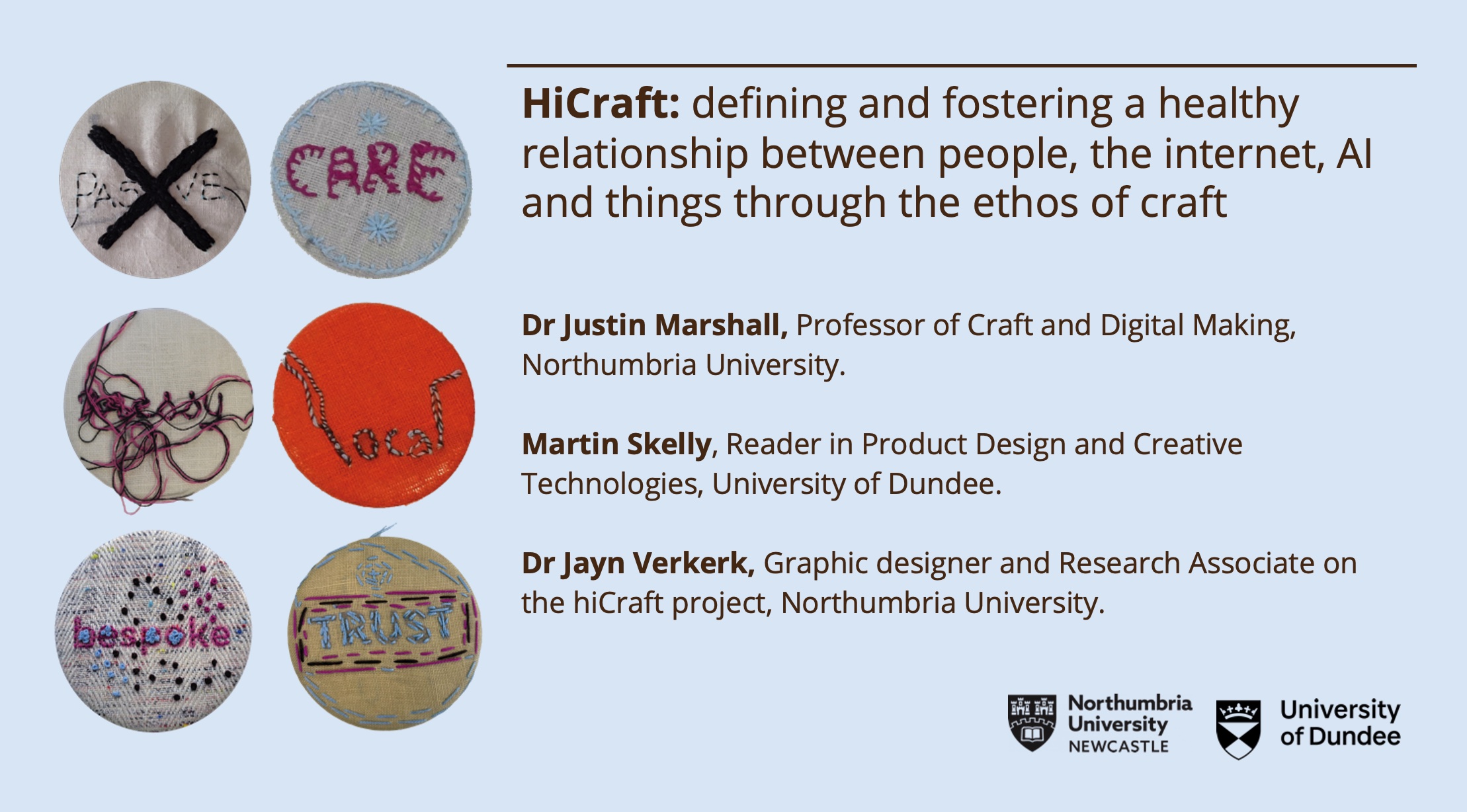 In October 2024 hiCraft joined forces with Creative Technologist Martin Skelly from DJCAD to deliver a panel discussion that focused how we might use the characteristics found in the practices and ethos of craft to speculate on an alternative ‘healthier’ vision of the Internet of Things (IoT), and the internet more broadly, including the role in of machine learning (AI) in how our data is collected and processed.