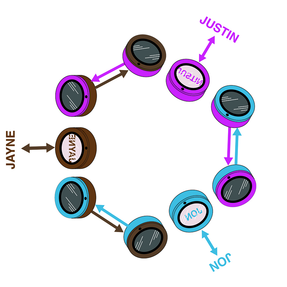 Three members of the research team (Jon, Jayne, Justin) initially discussed the notion of mirrorness and surveillance – how mirrors can feel like portals, evoking a ‘through the looking glass’ idea of a place that is the same but different to their own. In thinking about what it would mean for a mirror to be looking back at you, and how this is very much the case with a lot of our digital devices (where third parties can see our data, hear our voices or see our images) they talked about when would someone seeing into your life feel different to surveillance?