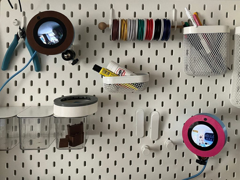 The hiCams have a grid of holes in their back plates that align to the standardised 0.1” hole separation found in 2D perfboard and breadboards and used as the foundation for circuit prototyping. We used this opportunity to create a range of components that provided the opportunity to attach devices both to established manufactured products (e.g. camera tripod stands, IKEA peg boards etc.) and to other more unusual, and less industrially standardised items, with hooks, eyelets and other attachments. While some where practical and functional, many were more playful, humorous, but they did provide the opportunity for us to explore personal aesthetic and materials preferences and lean into our craft/making skills. See pegBits project and poster for more details.